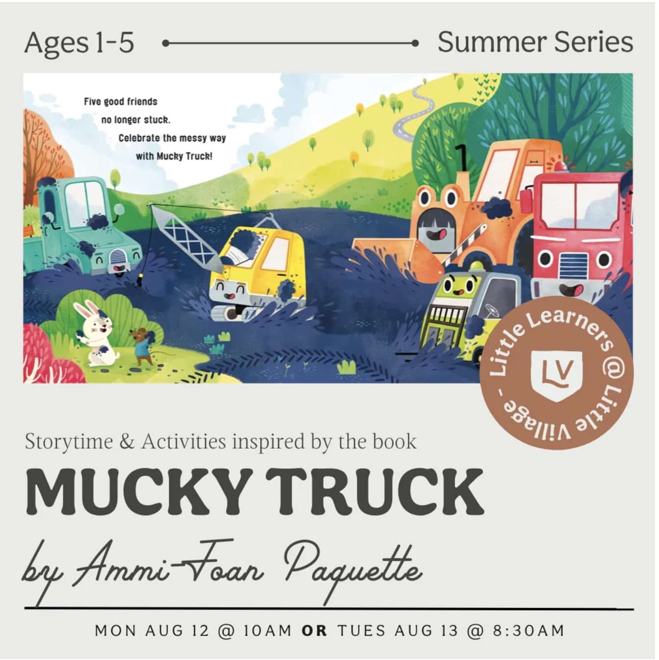 This week’s Little Learners class is based on the book Mucky Truck by Ammi-Joan Paquette, author of the best-selling Little Blue Truck series. 📚 Each child will enjoy this 90-minute session inspired by themes throughout the book, and receive a copy of the book to take home.